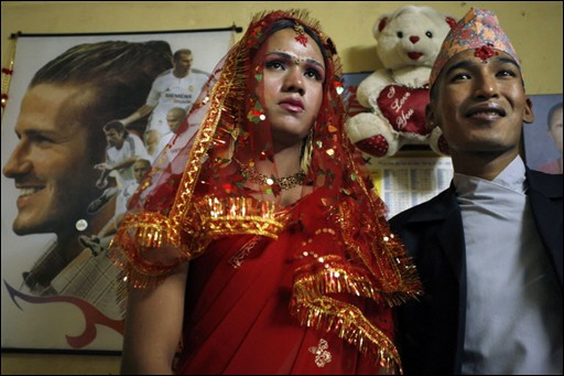 bruceDai, if you dont give a damn about who's whose b1tch, then why do you what they dress up as. They are homosexual not invisible or sorry for the choice of their lifestyle. They do what they prefer and if you dont fancy it, shut you eye. Sindoor, tika and red sari are not just for the Hindus, or else you would need to prove your religious affiliation before purchasing such items. They didn't steal these things from some nook. I bet they paid the same price any heterosexual would pay. So why such discrimination? And BruceDai, they do have balls. Have you ever imagined how much of guts would require to marry someone of the same sex in a culture like that of Nepal? These people made a decision and they are going to stick by it whether people like it or not. That in my books define having balls bigger than all the whinners put together. And if you didn't realize, they are being themselves. If it involves doing something that displeases you and your possies, may your heterosexual spirits be with you.
