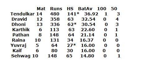 all i am saying is not because of his stat, but because of his condition. he's still got some juice to deliver for his team. consistently? -- i doubt. secondly, indian team is in a good enough position to play without him and perform well enough as a team. sometimes you've got to experiment. you have to risk in order to achieve. dravid, ganguly et al. are getting older as well. if i were an indian team supporter, i would want more yougsters playing and delivering before oldies disappear one by one from the team. LooTe