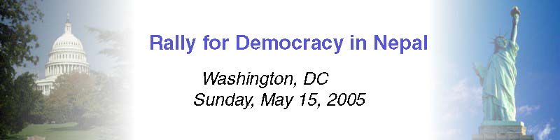 Blaming the advent of Maoist movement in Nepal to democracy just because it started during the post-Panchayat era is shallow, ignorant, and outright ludicrous. Serious (in terms of intensity by which they thrive) and protracted violent movements, like the Nepali Maoist movement, take years, if not decades, to ferment. The root of Maoist problem in Nepal is the culture of INEQUALITY and SUPPRESSION based on HIERARCHICAL system that was started by the Rana oligarchy and further perpetuated (at the most) and promoted (at the least) by the Panchayat autocracy. Therefore, the real and sustainable solution to Maoist crisis would come NOT from further absolutism by the King, but from genuine and sincere EMPOWERMENT of the people, which can ONLY be guaranteed in a democratic system. Despite many failures of successive democratic governments of the post-Panchayat era, one area that Nepal made remarkable progress under democracy -- albeit weak -- was in empowerment of the people who were ignored, suppressed (in various ways), and deprived of rights, privileges and opportunities, particularly those from the rural areas, who were/are the vast majority of Nepali population. In the long run, what really matters -- and what really holds true solutions to social ills (corruption being one of them) -- is the REAL and GENUINE power to the people. Yes, the progress was very slow and definitely was not enough, and much, much more needed to be done. Nevertheless, we would be mistaken not to recognize the fact that the progressive trend towards better awareness (among the people) was started and was slowly but surely gaining pace in the 14 years or so of nascent democracy in Nepal. Despite some serious difficulties, this trend need not be halted, NOT EVEN for a moment. KingG and his coterie of vision-deprived, obviously-not-fit-for-modern-times crooks, after extended efforts to undermine the democratic governments, have done just that. There is not a shred of doubt that the political parties needed to be profoundly reformed and the likes of Girija, Deuba and MaKuNe (who too lacked any sense of vision and who also heralded from the old school that makes absolutely no sense whatsoever in today's world) needed to be properly checked. However, this very process of desperately needed political, social and cultural transformation (not limited to political leaders alone) is not fathomable in any other system but DEMOCRACY. Any course towards reform and positive changes is ONLY viable in a democratic platform where the people can vibrantly debate, argue and draw constructive conclusions. Democracy, NOT autocracy ensures greater awareness among the people and empowers them. Empowered people create better political alternatives. Better political alternatives, in turn, obviously guarantees better results for the people. This is the way it works. And this is the way it SHOULD BE. Please join me and others at the rally in DC and support the cause for democracy in Nepal. This rally is not about the political leaders who undoubtedly have failed us time and again. Neither it is limited to fighting against absolutism of the King. This rally is about US -- it is about YOU and I and every Nepali who dares to dream of a better future for OURSELVES. After all, it is not up to Girija, or MaKune, or Deuba, or KingG to deliver for us. We have the keys to our own future and it is only when we develop a sense of collective confidence in OURSELVES -- through DEMOCRACY -- that we will succeed in achieving what now seems impossible. Better then is achieved by believing in ourselves now. Let's believe in OUR rights, OUR strengths and OUR future. Let's not let an individual take those away from us. Washington, DC, May 15th, Sunday. Be there!