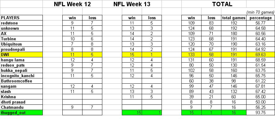 good week for me as well.... boyz loss was disappointing and Bengals seems to be for real.... this is the first time i am able to crack 60% mark for this season :=) reddu bru, can ya see me??? 110 ma tuffan kuddai chu moe ta ;) eagles pick garya??? testai huncha :p