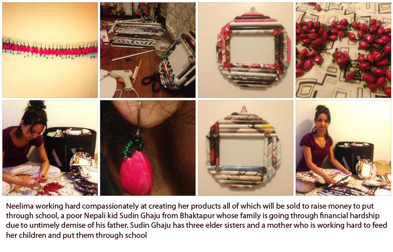 Neelima Manandhar was featured in sajha last year for her design aspirations of making practical artwork out of day to day recyclable goods. ( See Feature page). Sajha is pleased to announce Neelima will be collaborating with sajha.com to make a difference in a poor student's life. She is offering to make use of her time and effort to fund a child to go to school who would otherwise not be able to afford it.