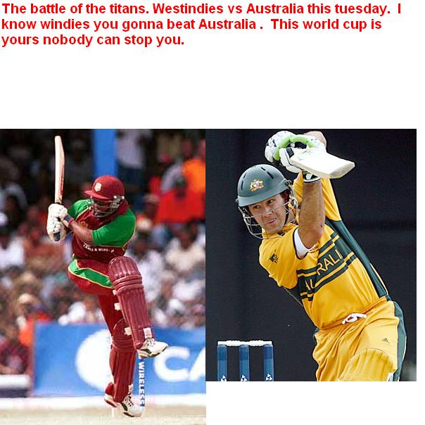 lou hi sathi ko, Lara n co. lai jassari pani jitounai parchha. Aussies ko khutta bhachhnai parchha............. GO WINDIES