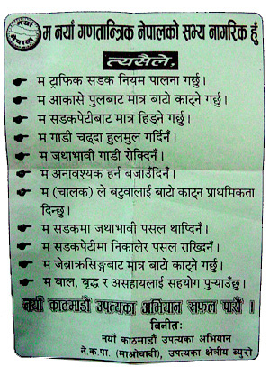 केहि थप १) म माओबाद जिन्दावाद् भन्छु २) म माओबादि बाहेक अरु बुडा हुन्छन भनेर विस्वास गर्दिन ३) म नेपाल प्रहरि को हो चिन्दिन ४) जरिवाना तिर्नु परे माओबादि कार्यालयमा हाजिर हुन्छु ५) पुश्प कमल दहाल र बाबुराम को सवारि भएमा फूल माला लिएर स्वागत गर्न बस्नेछु।