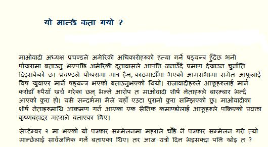 If there was proof then why are they taking this long???? ढिलो गर्नु को अर्थ प्रमान् तयार् गर्नु हो ।।।भयेको चिज् अगाधि देखाउन समय चहिदैन।।।हैन प्रमाण तयार गर्न...tampering लाई अरु टाईम चाँहीएको हो भने त क कुरा भो र.... if at all they come out with genuine stuff as proof राजा र राजकुमार दुबै देखिनु पर्छ...both should be seen ordering some thing that maoists claim at this point...killing ko अर्डर दिदै गरेको proof ...nothing less....कम्प्युटर ले fabricate गरेको blurry द्रीश्य देखाएर जनता झुक्कने दुशाहश् माओवादी ले नगर्दा हुन्छ।