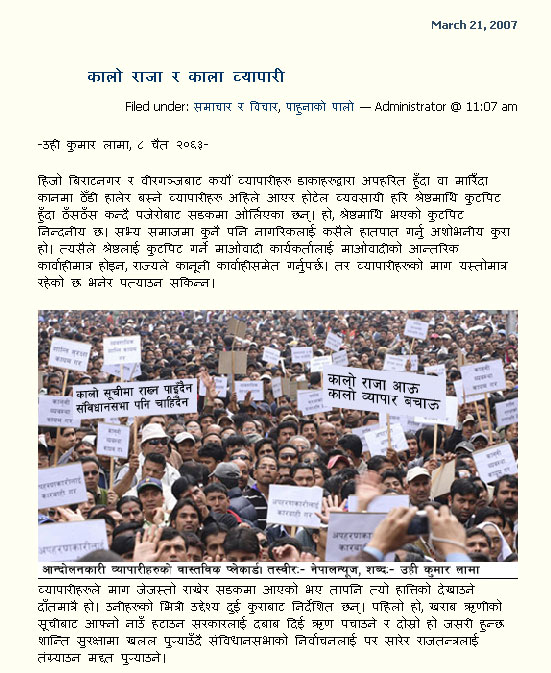 Freak alien bro, The picture is still there at mysansar. http://www.mysansar.com/?p=1409#more-1409 Saroj bro, Either you didn't read the article carefully or you didn't get the message behind the picture. If you have been following Kumar Lama's articles, he loves to satire and the morphed pic is an example of it. Those hightlighted playcards are not real ones in the rally. They are just to depict the real motive behind those playcards. Please, look at the caption of the picture carefully.. Picture : Nepal news Words: Kumar Lama
