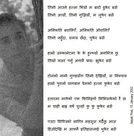 नेपे गुरु साह्रै मिठो गजल ,शायद आम युबाहरुको कथा आज मैले पनि एउटा गजल थपेको छु सदा झै सुझाबको आशामा झर्को फर्को तिम्रै ठुलो, अझै घुर्काउछौ तिमी सानोतिनो कुरामा नि ,आशु तुर्काउछौ तिमी मन सफा भए गंगा ,लोटामा पनि अटछ सन्का पाली लन्का खाने, कुरा हुर्काउछौ तिमी