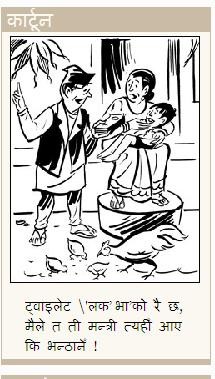 धेरै जना ले देशमा कानून ले केही गरेको छैन भनेर भन्ने होला। त्यसो भए, कानून संबिधान अनुसार मन्त्रिज्यू किन सपथ खानु हुन्छ? निर्बाचन् आयोगको कानून नियम मानेर किन चुनिनु हुन्छ? तलब भात्ता किन हसुर्न हुन्छ। जंगलमै जानुस्, जंगली राजा गर्नुस्। ट्वाइलेट् मा मात्र होइन, अन्त जहाँ जहा मन लाग्छ थुन्नुस्। शान्ती प्रकृया मा सामेल भएर देश को मूल राजनीतिमा आए पछी त नियम कानून मान्नु पर्यो नि। माओवादी मन्त्री भएकैले यात्रो हल्ला गरेको भन्नु हुन्छ एक थरी विद्वान हरु। माओवादी के खाओबादी ले गरेको भए पनि नराम्रो कुरा लाई नराम्रो भन्नु पर्छ, आफुमा अलिकती पनि बिबेक छ भने। होइन भने जे गरे पनि ठीक छ। राजाको प्रत्यक्ष शासन कालमा पनि केही यादब जस्ता सन्काह छेत्रीय प्राशासकहरुले कर्मचारीलाई ट्वाइलेट् मा थुनेका थिए, त्यती बेला पनि यस्तै बिरोध भएका थिए। हजारौं कर्मचारीहरुले देशमा लोकतन्त्र पुनर्स्थापना को लागि आन्दोलनमा भाग लिएका थिए। ती सब चोर् भए, आफु सत्ता मा पुग्ने बितिक्कै? त्यसैलेमन्त्री यादव को ठाउंमा स्यादब भए पनि आमानबिय र गैरकानूनी काम को निन्दा गर्नै पर्छ। एक थरी जसले राम हरी श्रेष्ठ को हत्या पनि स्याबास कामरेड भनेर ताली पिटेका छन, तिनिहरुको हक मा यो लागु हुँदैन। हत्या हिंसा त तिनको संस्कार हो। ट्वाइलेट् प्रकारअण त सानो घाऊ जती पनि भएको छैन। राजाको शासन पनि यस्तै यस्तै गल्तिहरुको लामो पुलिन्दाबाट सुरु भएर अन्तमा नामोनिशान मेटिए। कंस, हिरण्यकश्यपुर को कथा, कथा मात्र थिएन। बुझ्ने लाई श्रीखण्ड नबुझ्नेलाई रक्त चन्दन।